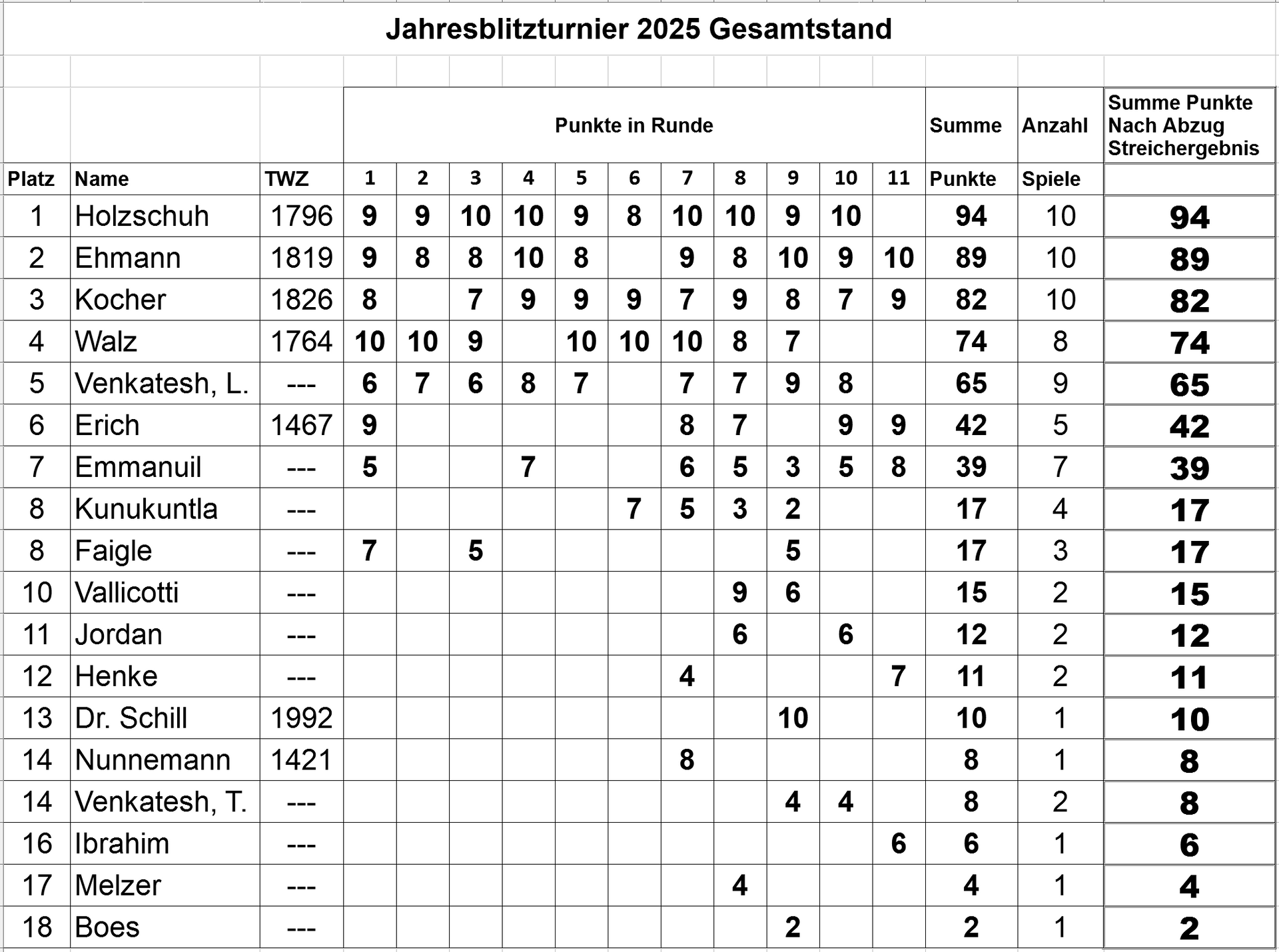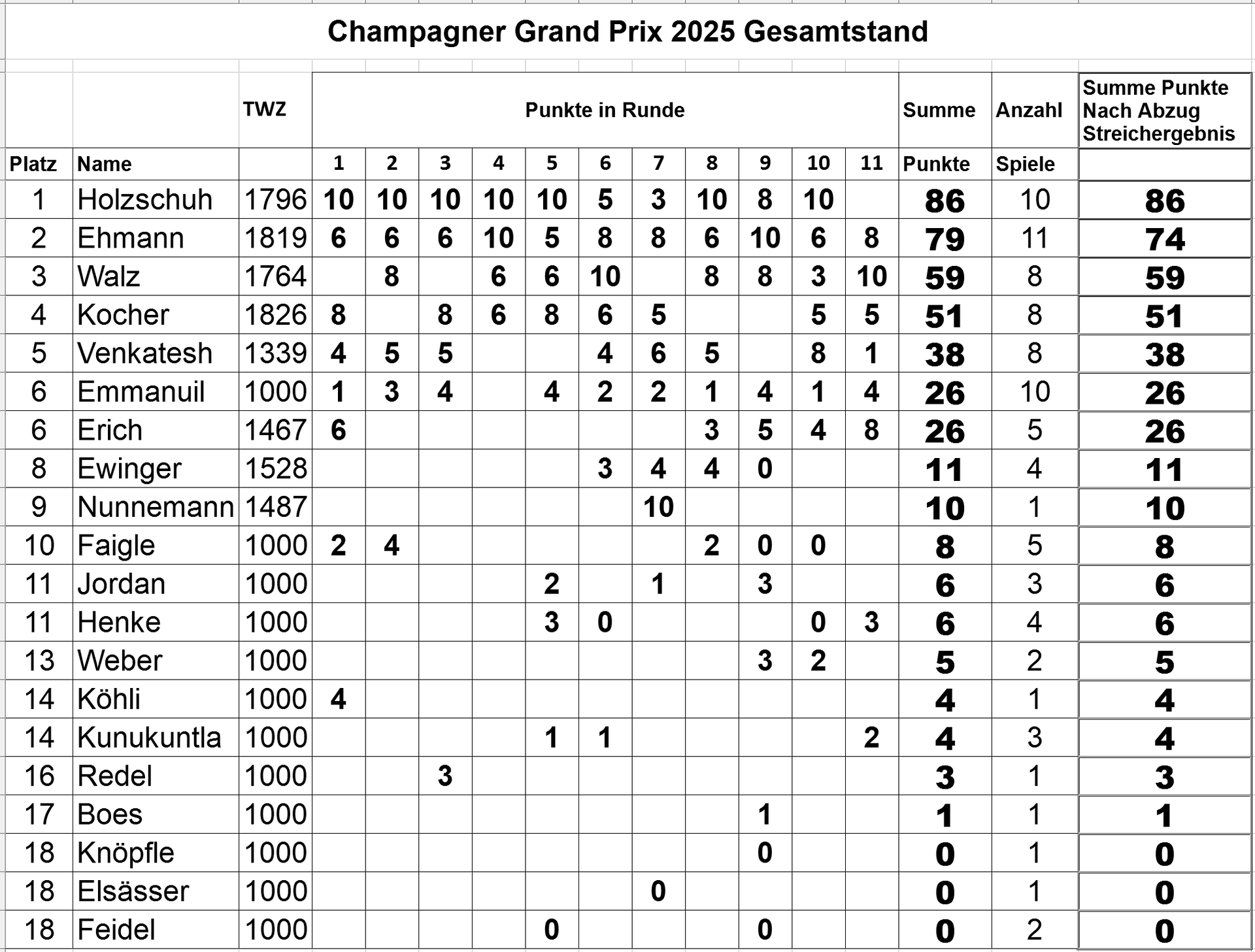 abgeschlossenes Turnier. Die erzielten Punkte werden das ganze