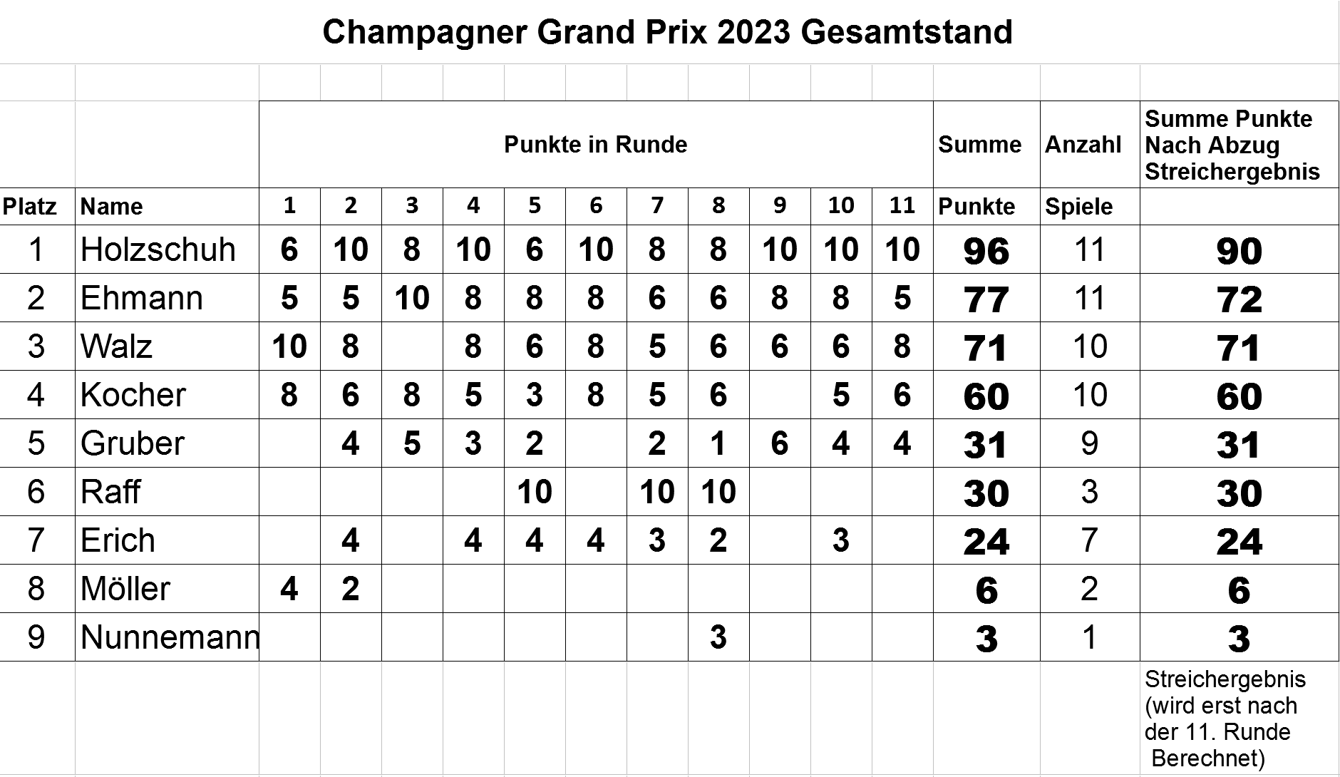 | - bei jeder Jahresturnierrunde handelt es sich jeweils um ein abgeschlossenes Turnier. Die erzielten Grand-Prix-Punkte werden das ganze Jahr gesammelt. Im Dezember nach der letzten Turnierrunde erfolgt die Endauswertung: Das schlechteste Rundenergebnis derjenigen Spieler, die an allen ausgetragenen Runden teilgenommen haben, wird am Jahresende gestrichen (Steichergebnis). |