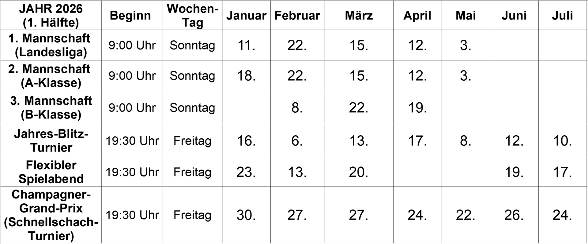 | Allgemein gilt die Regel 'immer am letzten Freitag im Monat (außer bei Schulferien)'; maßgeblich sind aber vorige Angaben. Beginn der Anmeldung 19.30 Uhr. 7 Runden Schweizer System mit Buchholzwertung (bei 8 oder weniger Teilnehmern Rundensystem jeder gegen jeden). |